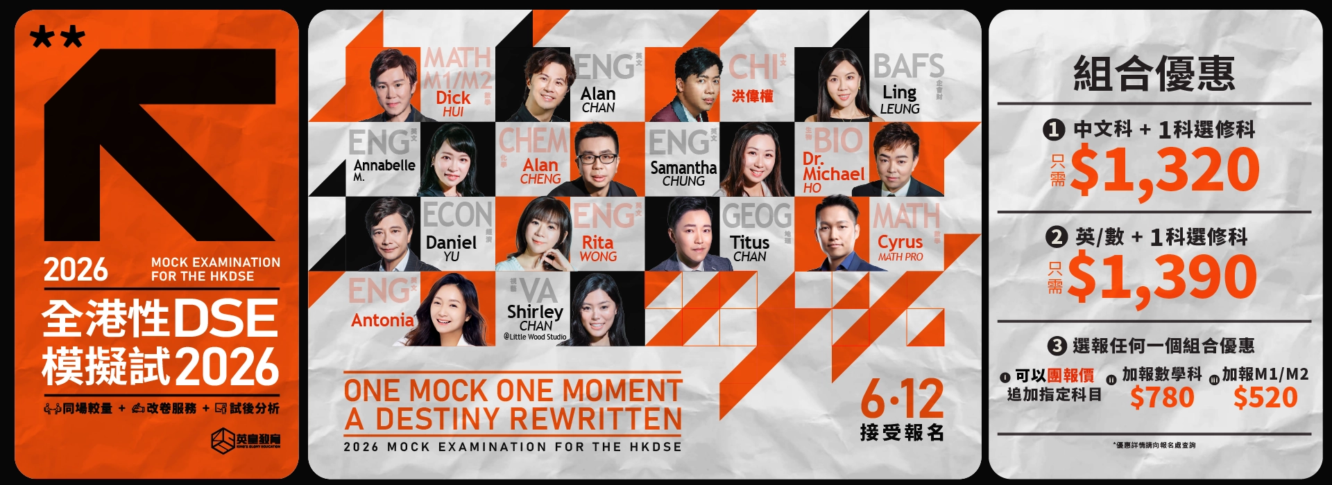 | Cyrus Yeung | 數學科 (必修部分) 卷一、二 | 23/2 (Mon) | 12:00-16:00 | 九龍灣利基 | 900 | 830 | 3人團報# $760 | 12月6日(星期六) 10:30am 開始報名 |